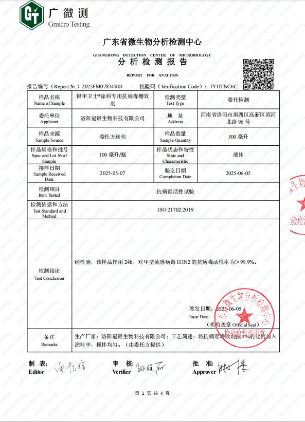 冠银生物以其在银离子行业应用领域的技术优势,参与编制了涂料行业国家标准GB/T21866《涂膜抗病毒活性和抗菌性测定法》,并将于近期发布实施。这体现了冠银生物在涂料银离子应用方面的专 业性,也为未来在涂料行业的拓展应用奠定了坚实基础。
